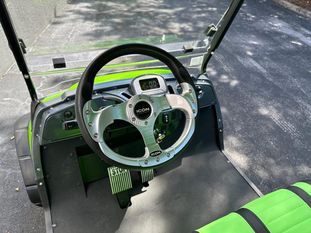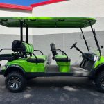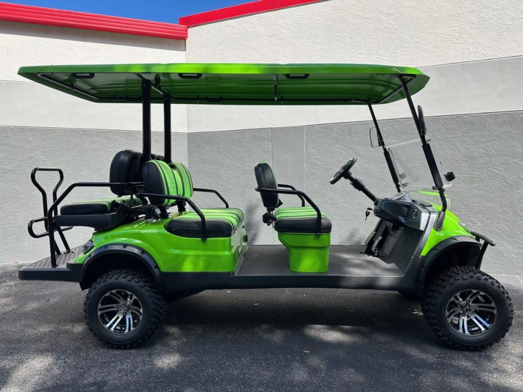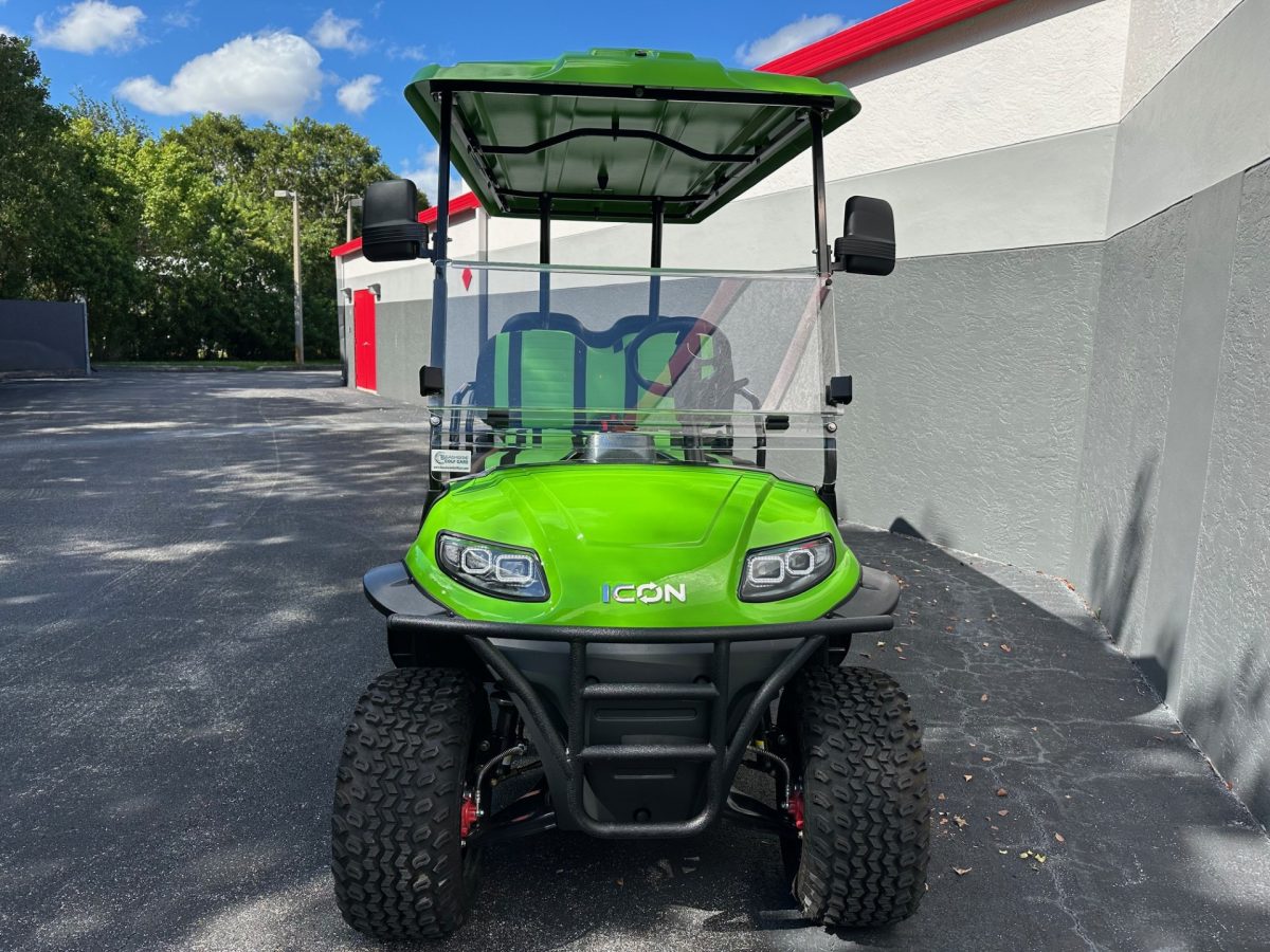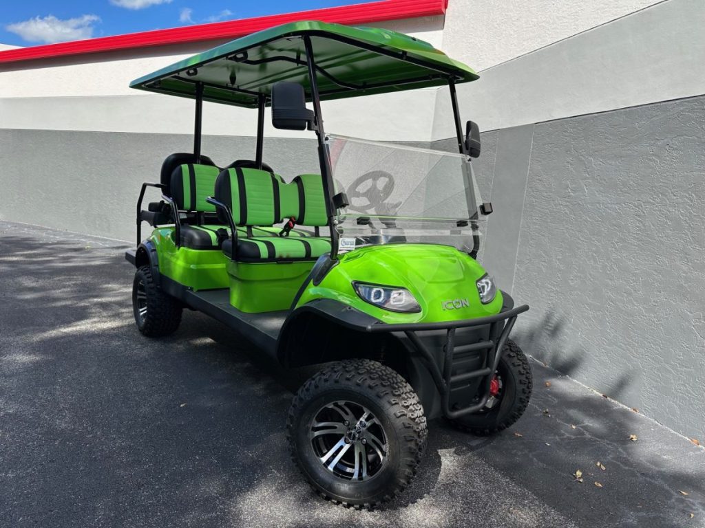 The ICON i60L is a lifted 6-passenger golf cart built for power and comfort. Featuring a 5 kW motor, 51 V lithium battery, four-wheel disc brakes, independent suspension, LED lighting, and 12″ aluminum wheels, it delivers smooth performance and head-turning style on or off the course
