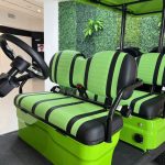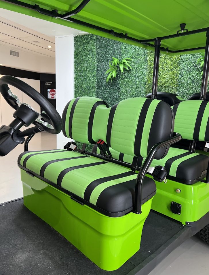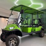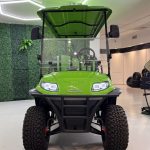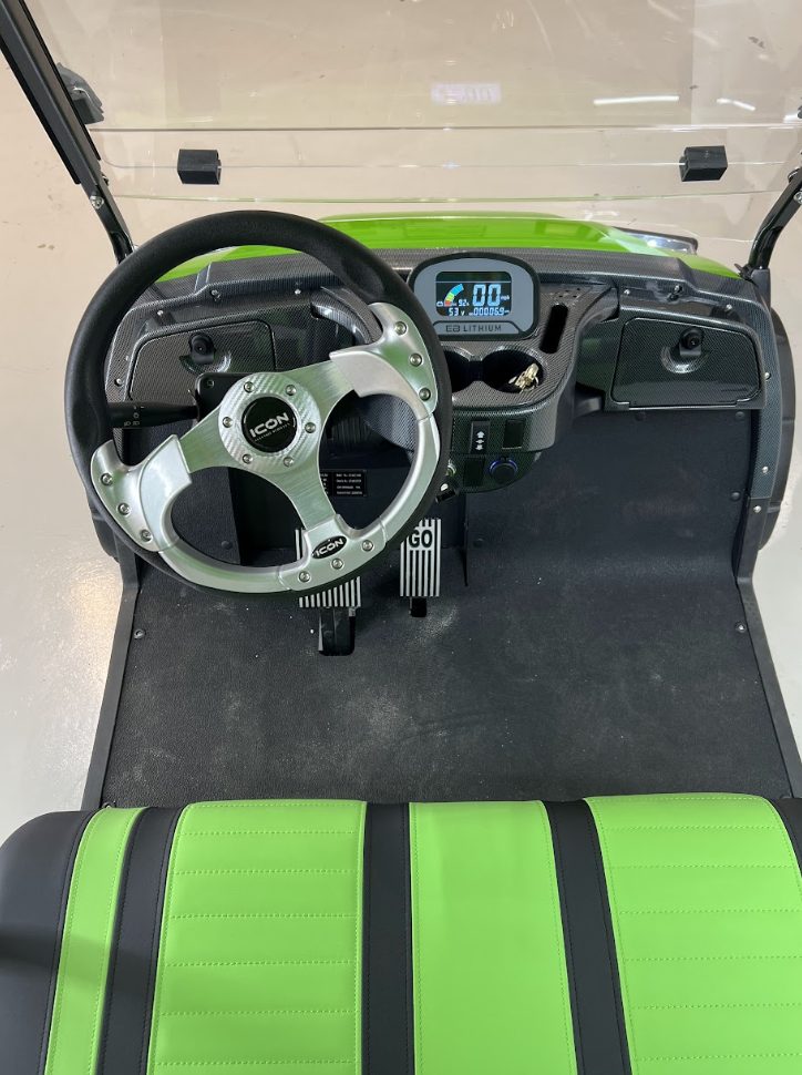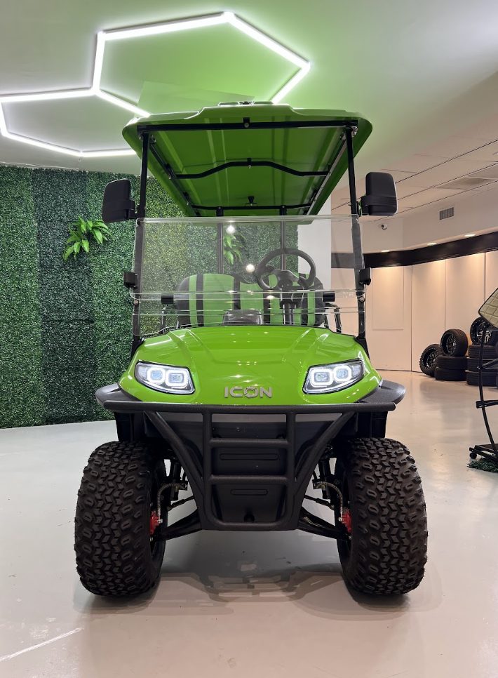 The ICON i60L is a lifted 6-passenger golf cart built for power and comfort. Featuring a 5 kW motor, 51 V lithium battery, four-wheel disc brakes, independent suspension, LED lighting, and 12″ aluminum wheels, it delivers smooth performance and head-turning style on or off the course