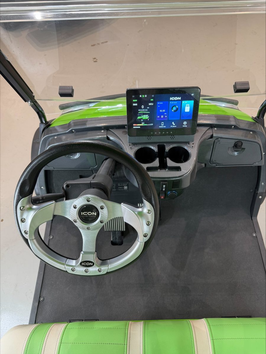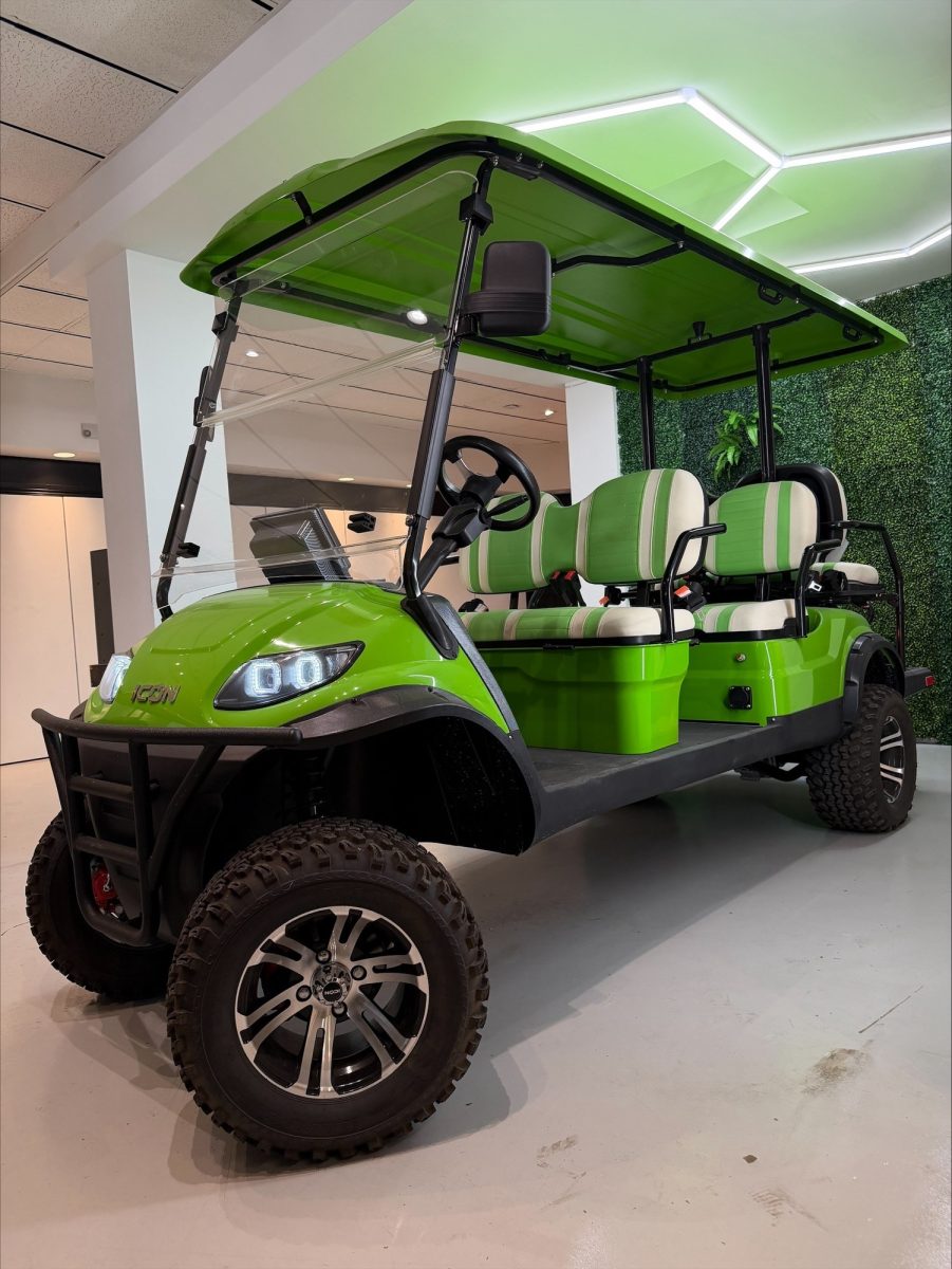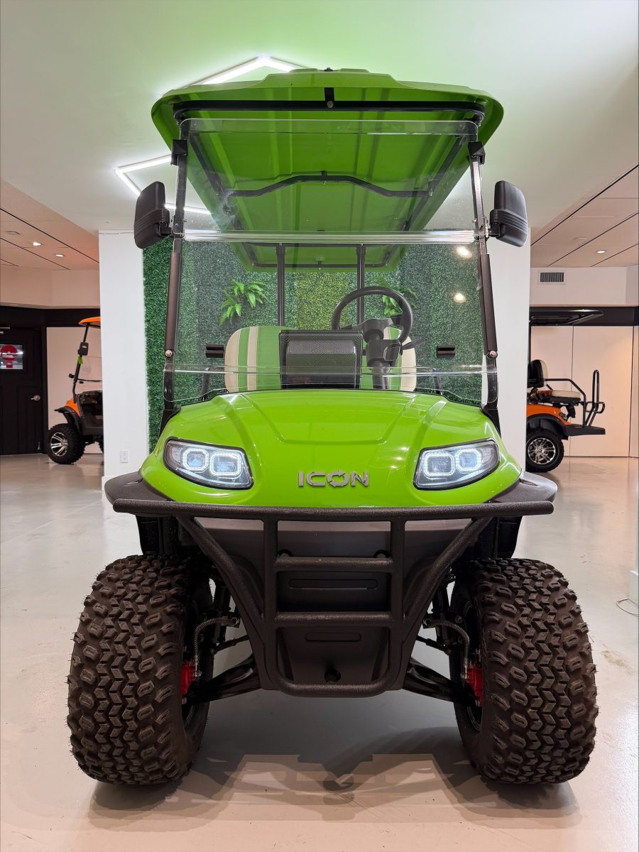 The ICON i60L is a lifted 6-passenger golf cart built for power and comfort. Featuring a 5 kW motor, 51 V lithium battery, four-wheel disc brakes, independent suspension, LED lighting, and 12″ aluminum wheels, it delivers smooth performance and head-turning style on or off the course. TouchScreen Included!