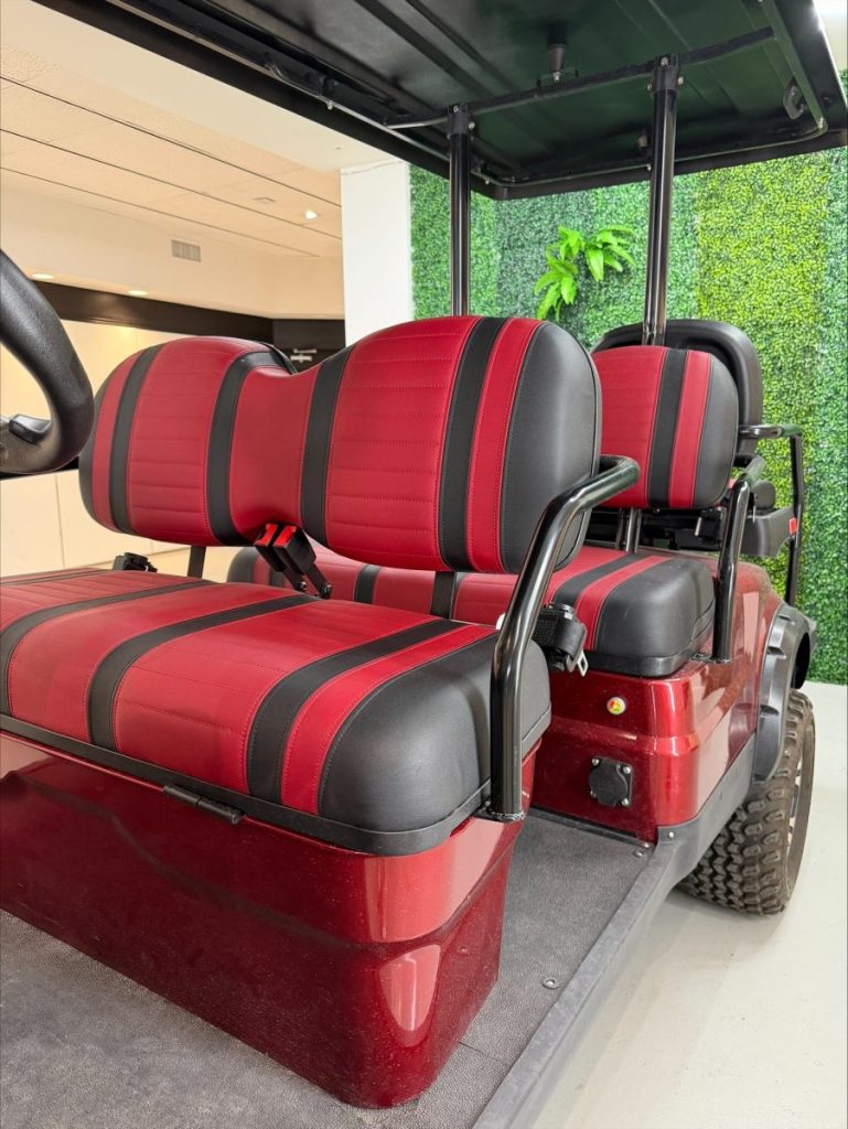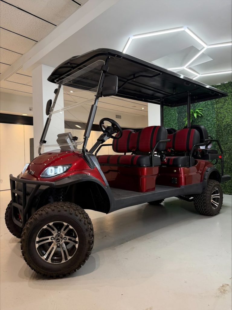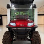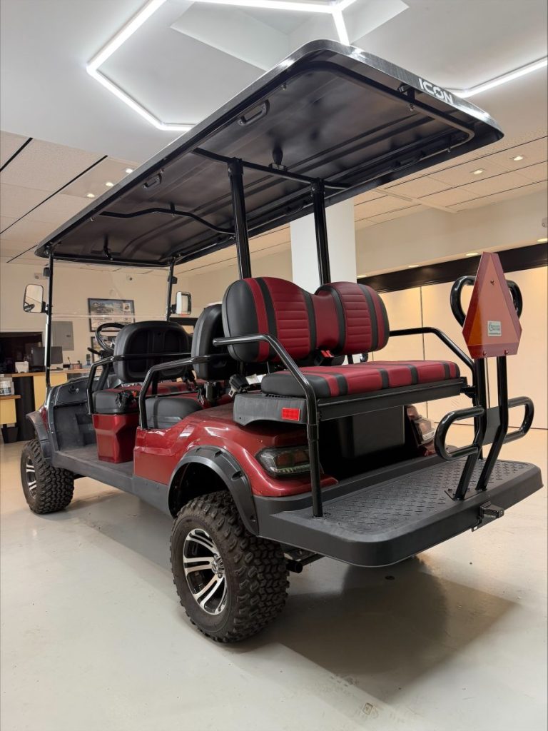 The ICON i60L is a lifted 6-passenger golf cart built for power and comfort. Featuring a 5 kW motor, 51 V lithium battery, four-wheel disc brakes, independent suspension, LED lighting, and 12″ aluminum wheels, it delivers smooth performance and head-turning style on or off the course. TouchScreen Included!