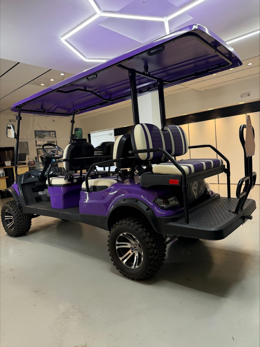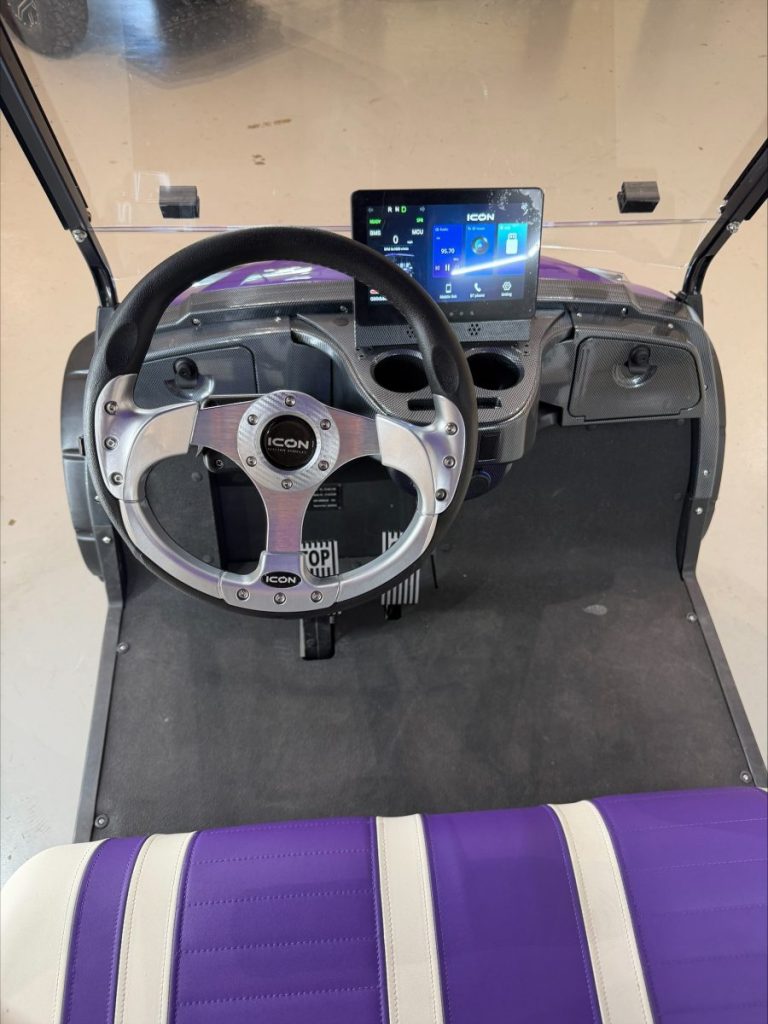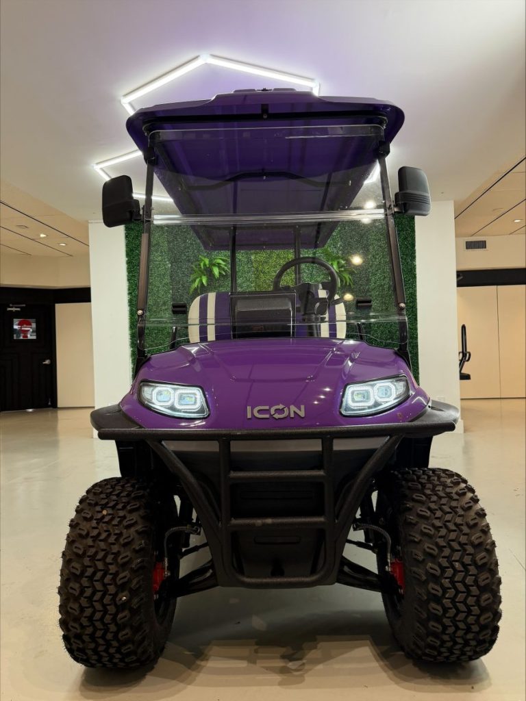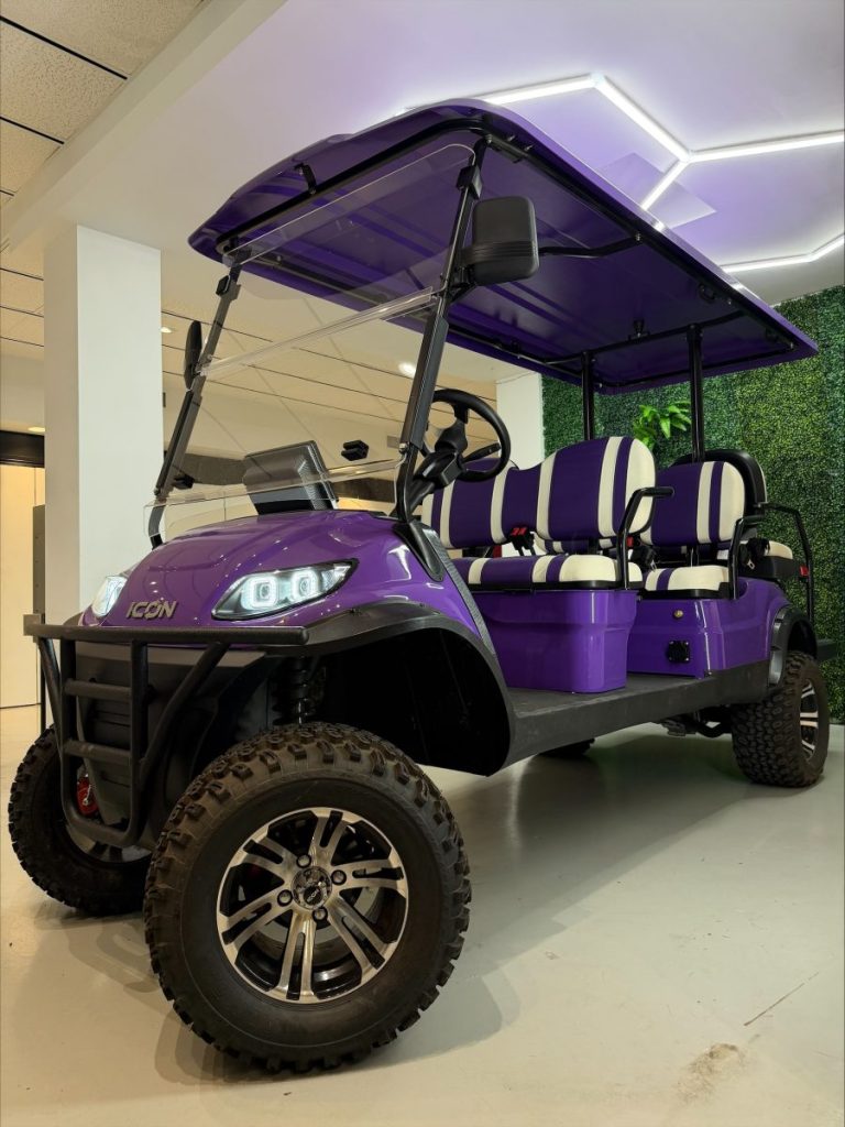 The ICON i60L is a lifted 6-passenger golf cart built for power and comfort. Featuring a 5 kW motor, 51 V lithium battery, four-wheel disc brakes, independent suspension, LED lighting, and 12″ aluminum wheels, it delivers smooth performance and head-turning style on or off the course. TouchScreen Included!