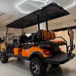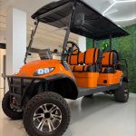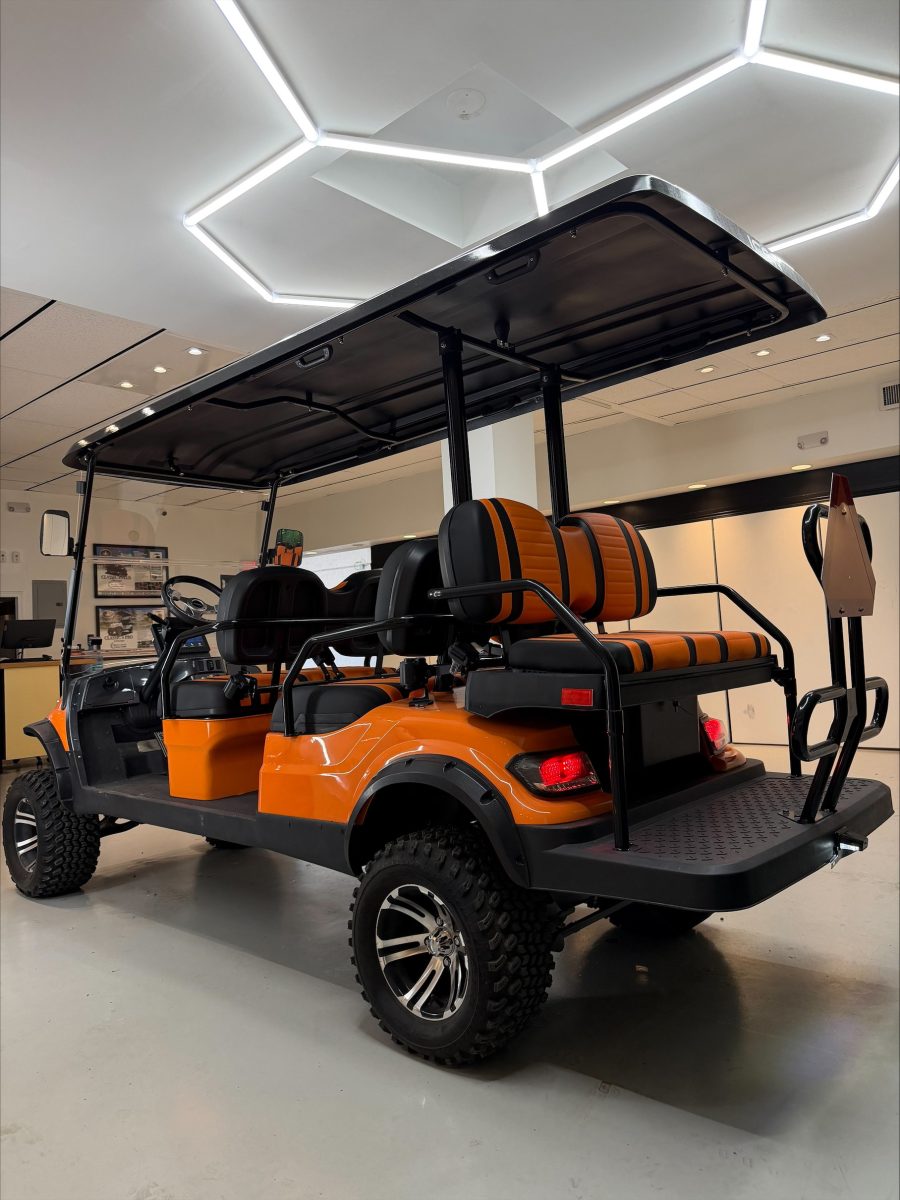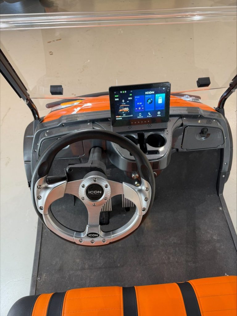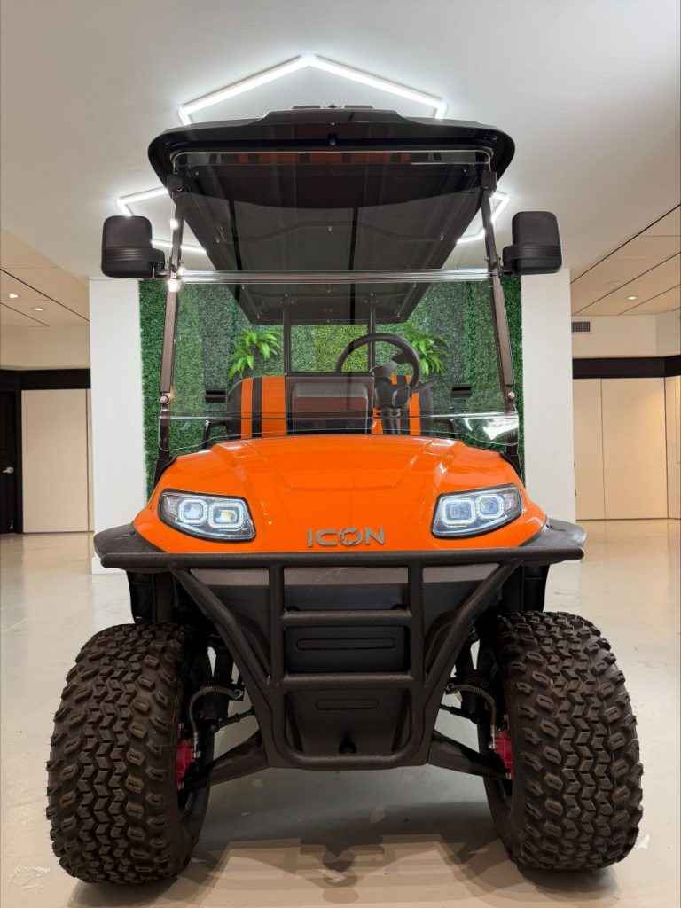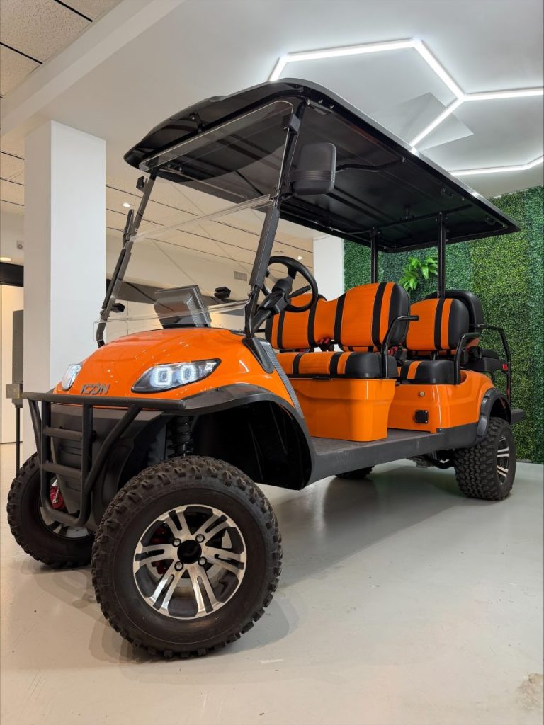 The ICON i60L is a lifted 6-passenger golf cart built for power and comfort. Featuring a 5 kW motor, 51 V lithium battery, four-wheel disc brakes, independent suspension, LED lighting, and 12″ aluminum wheels, it delivers smooth performance and head-turning style on or off the course. TouchScreen Included!