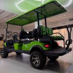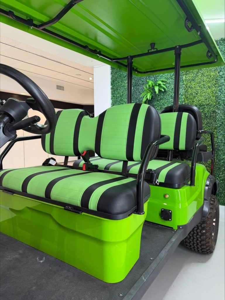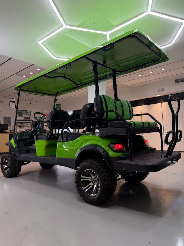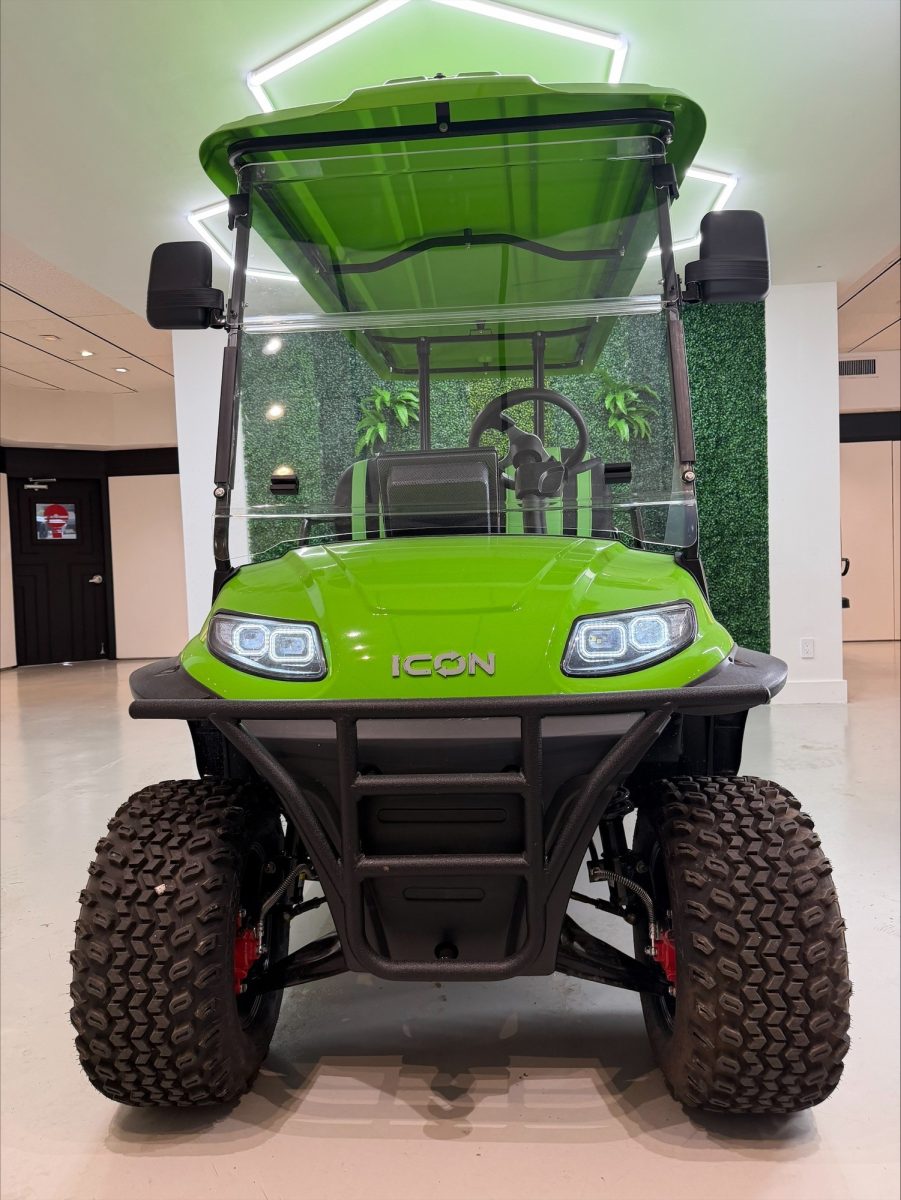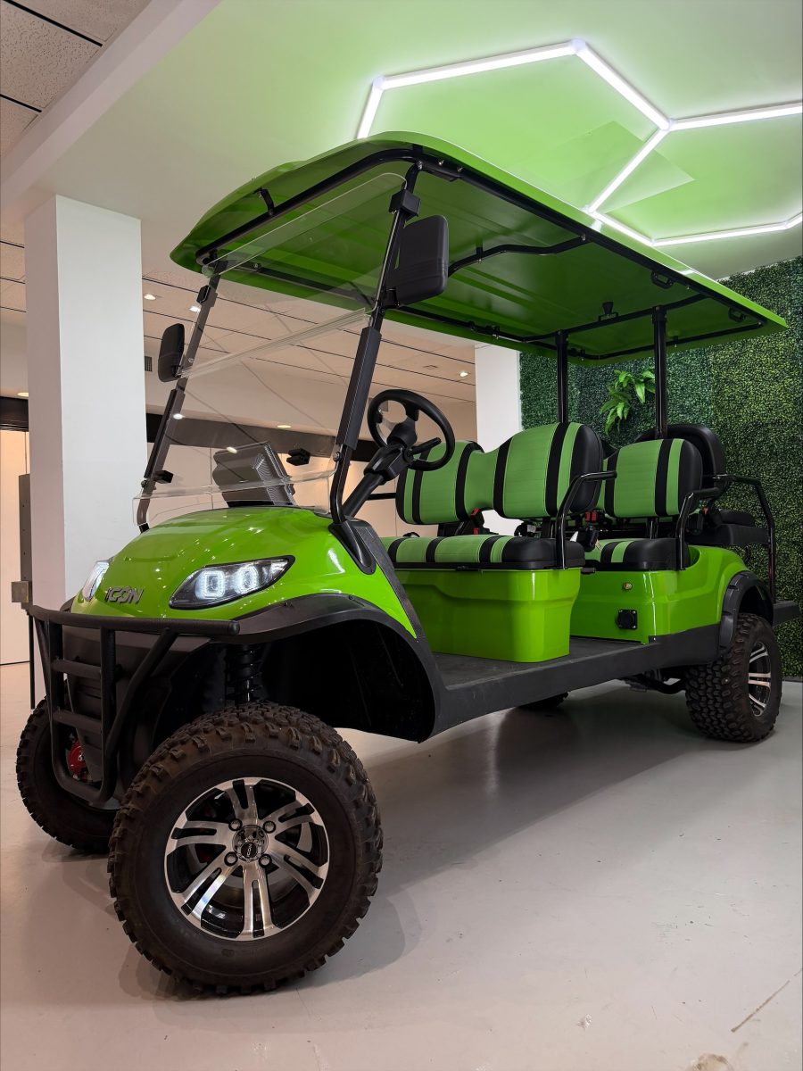 The ICON i60L is a lifted 6-passenger golf cart built for power and comfort. Featuring a 5 kW motor, 51 V lithium battery, four-wheel disc brakes, independent suspension, LED lighting, and 12″ aluminum wheels, it delivers smooth performance and head-turning style on or off the course. TouchScreen Included!