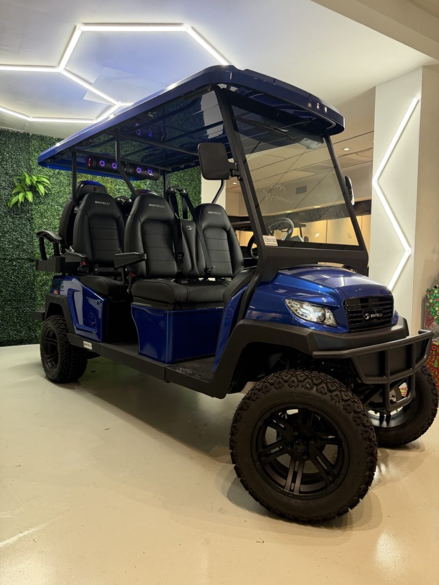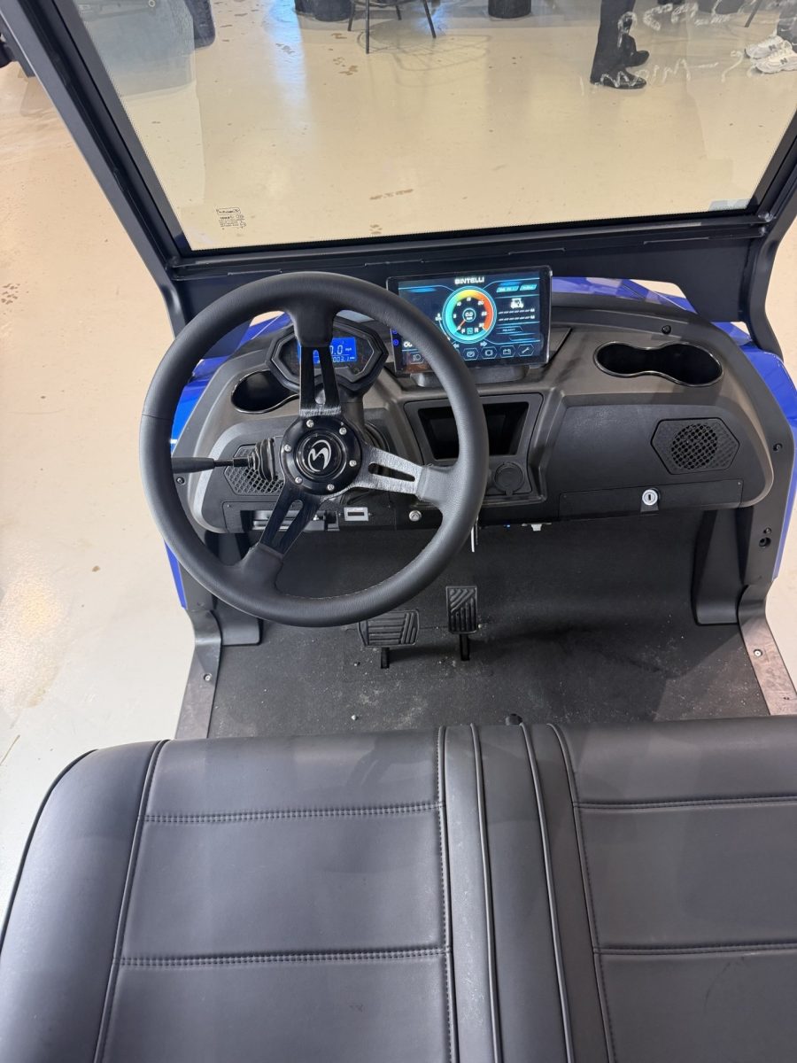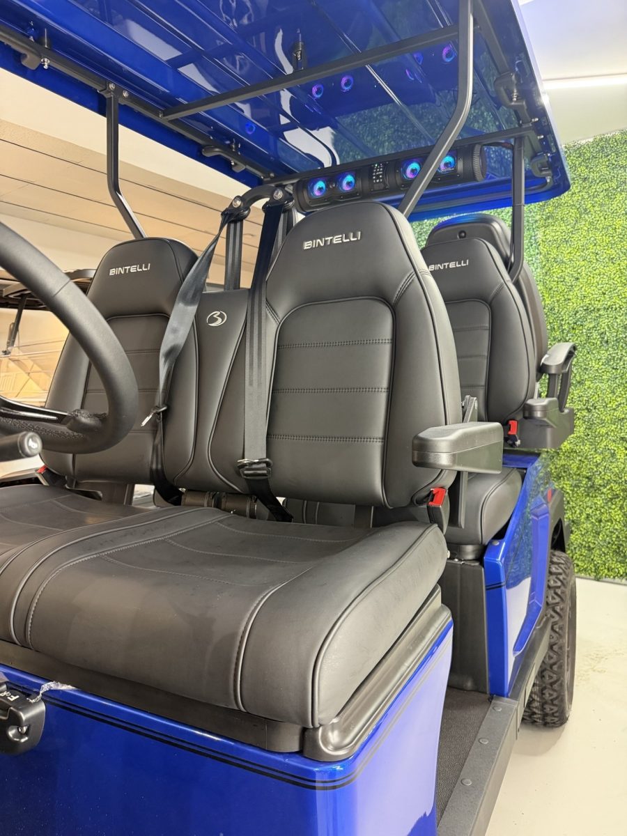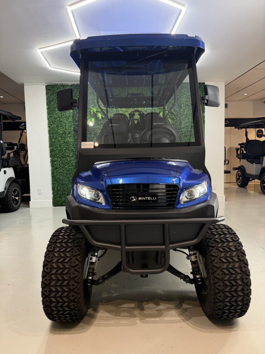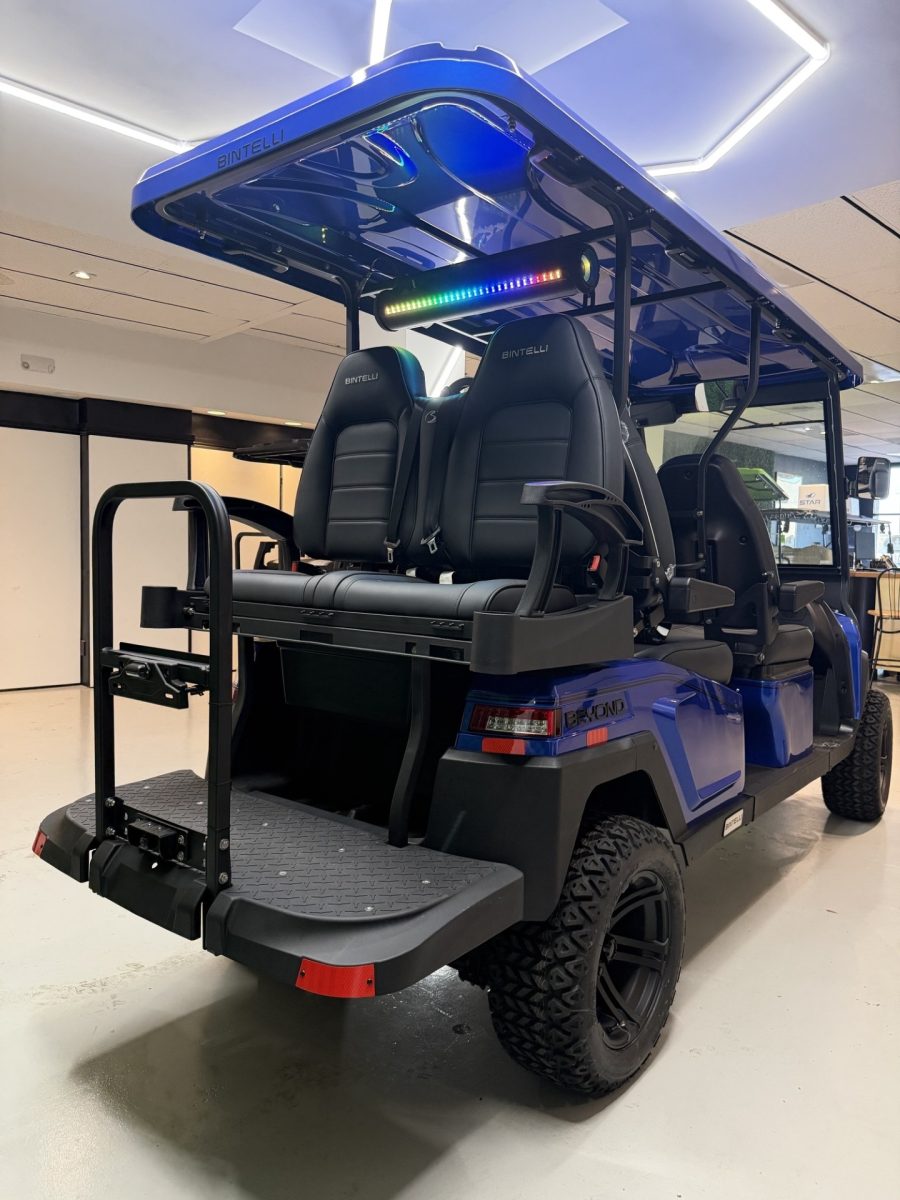 This Bintelli Beyond 6 street legal golf cart is the newest addition to the Bintelli fleet and it is FULLY loaded! Complete with an aluminum frame, aluminum roof supports, AC motor, LED lighting, 23″ tires, a Bluetooth sound system, reverse camera, hydraulic disc brakes, two-tone premium seats, on-board smart charger, dual USB plugs, extended roof, rear flip seat, head lights, tail lights, turn signals, DOT windshield with wiper, DOT tires, DOT 3-point seat belts, and 105 AH Lithium Battery!