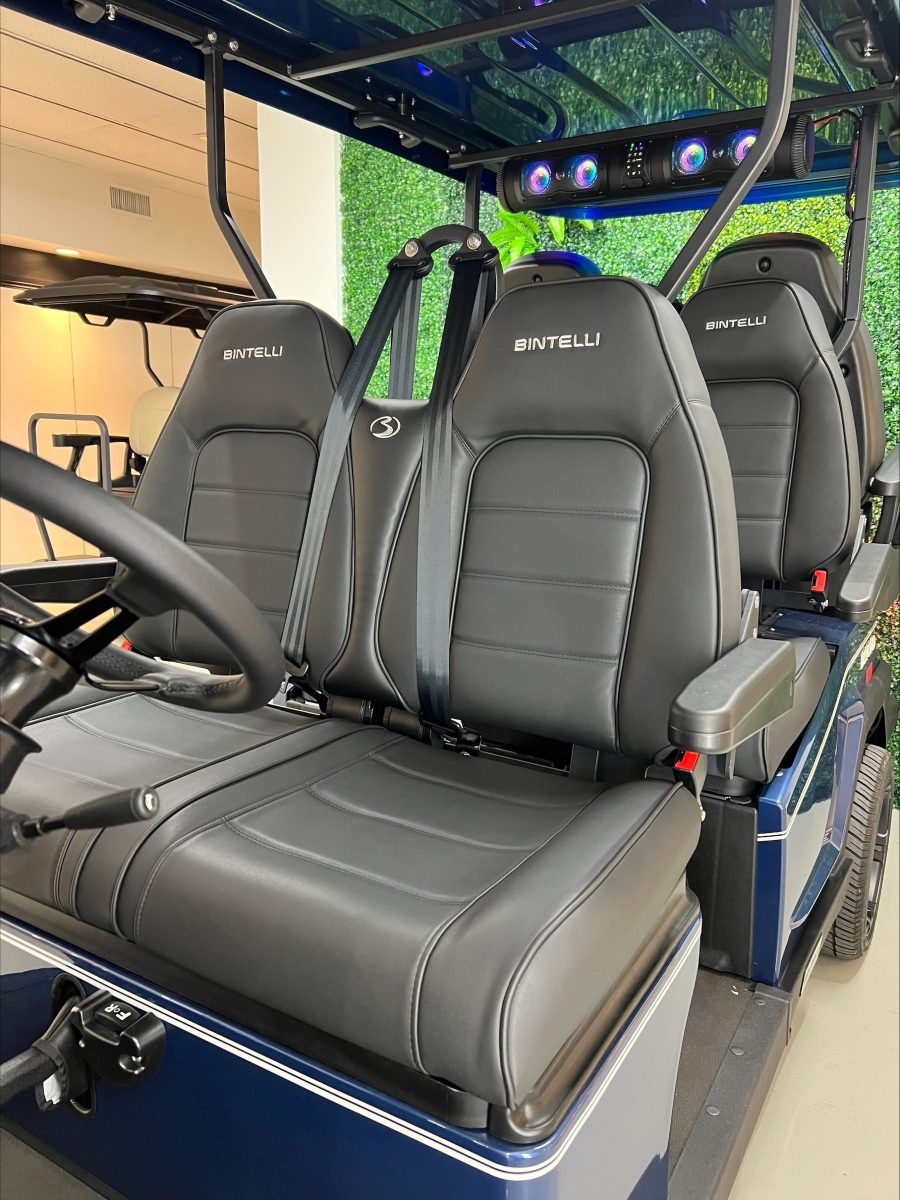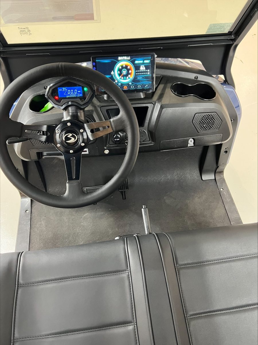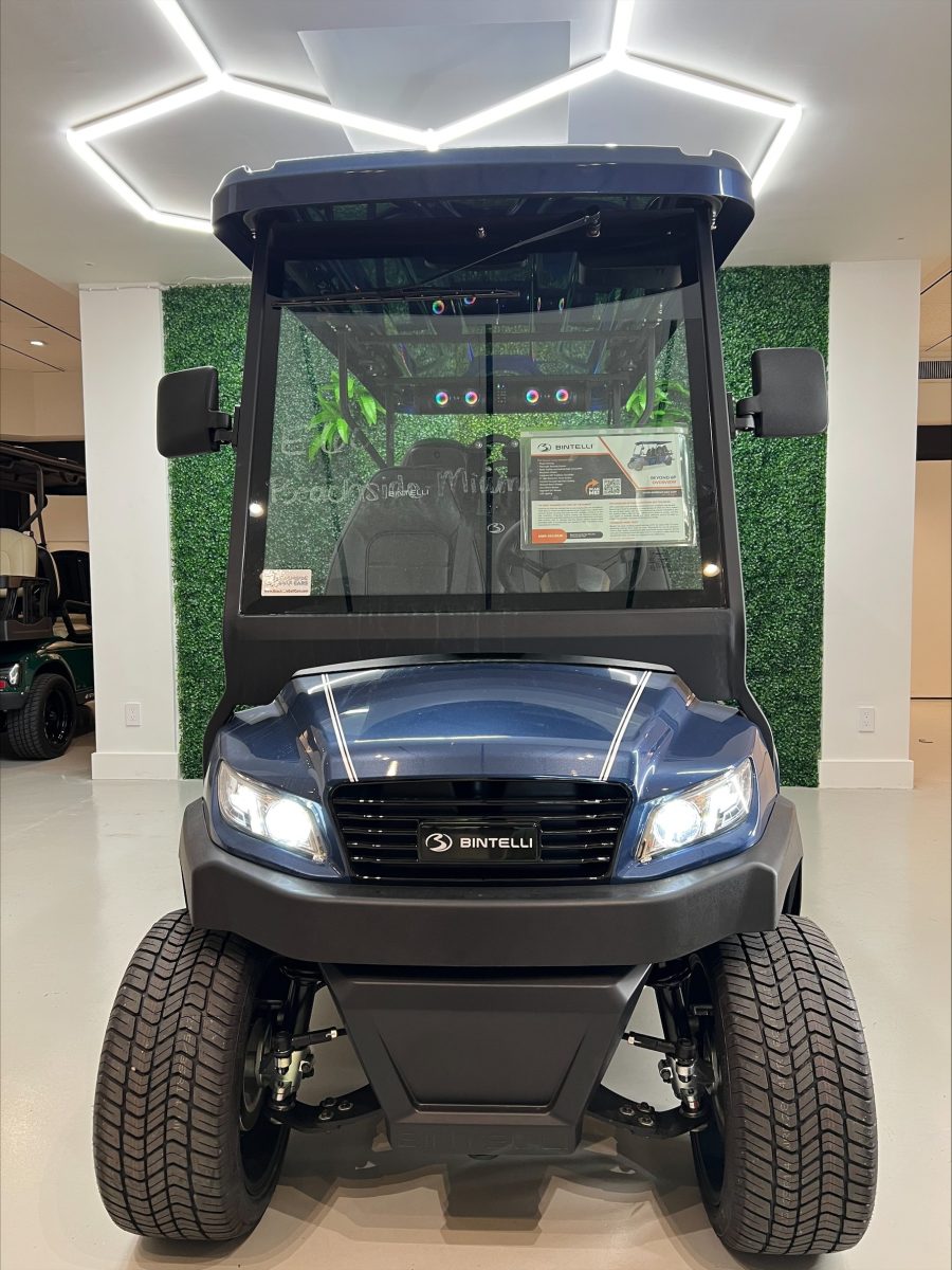 This Bintelli Beyond 6 street legal golf cart is the newest addition to the Bintelli fleet and it is FULLY loaded! Complete with an aluminum frame, aluminum roof supports, AC motor, LED lighting, 23″ tires, a Bluetooth sound system, reverse camera, hydraulic disc brakes, two-tone premium seats, on-board smart charger, dual USB plugs, extended roof, rear flip seat, head lights, tail lights, turn signals, DOT windshield with wiper, DOT tires, DOT 3-point seat belts, and 105 AH Lithium Battery!